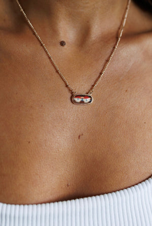 Made of Imitation gold plated, lead-nickel-free alloy box copper bead chain metal material. Middle pattern art of the necklace is resin.
