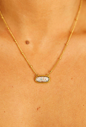 Payment PlansThis 18-inch necklace features a delicate bead chain crafted from imitation gold-plated alloy with box copper components. The metal is lead- and nickel-free for comfortable everyday wear. At the center, a smooth resin focal piece adds a modern, polished touch, making this necklace an easy statement for layering or wearing on its own.